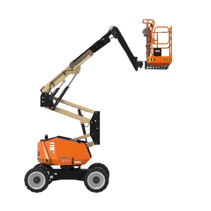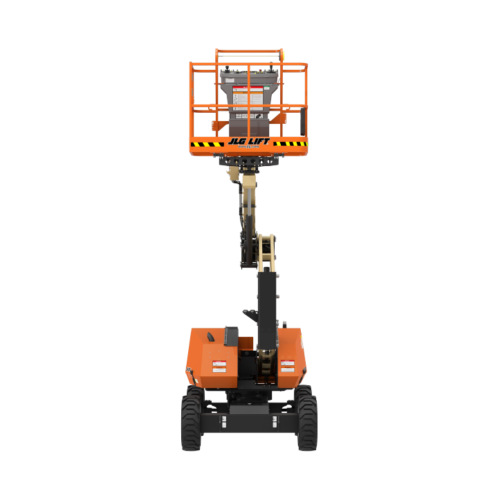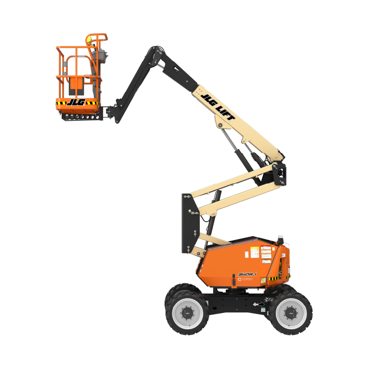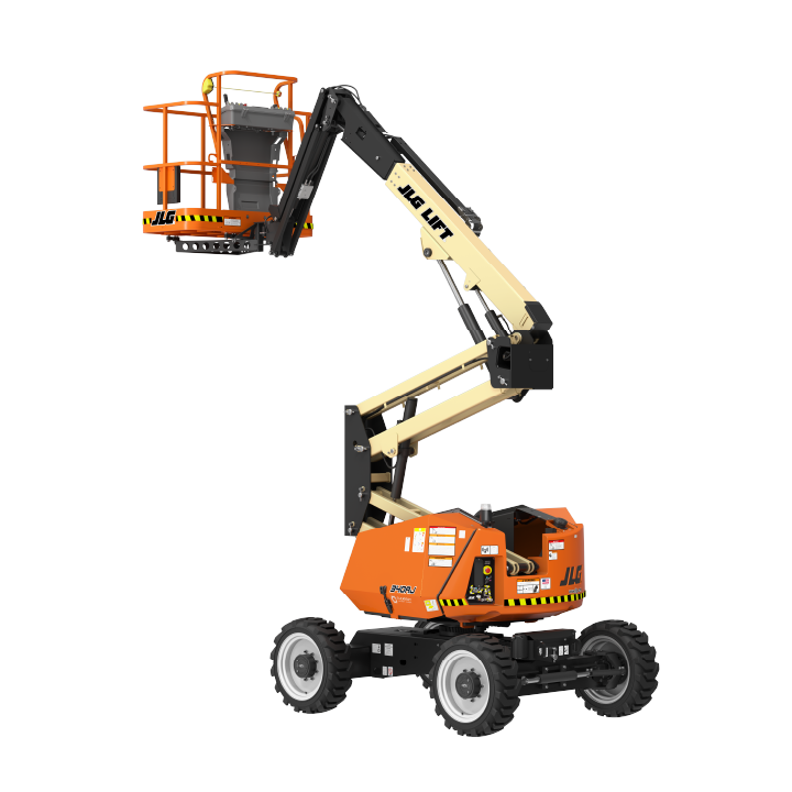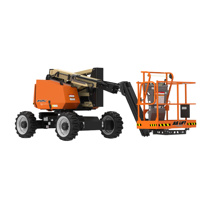 JLG 340AJ Platform height: 34 ft. Horizontal outreach: 19 ft. Platform capacity: 500 lbs. Operating weight: 10,175 lbs. DSL engine