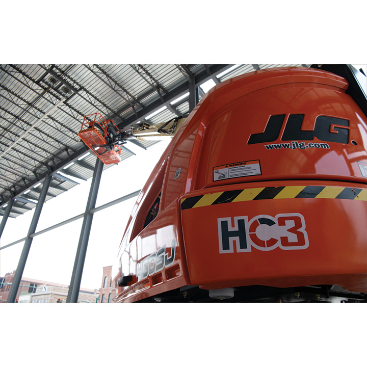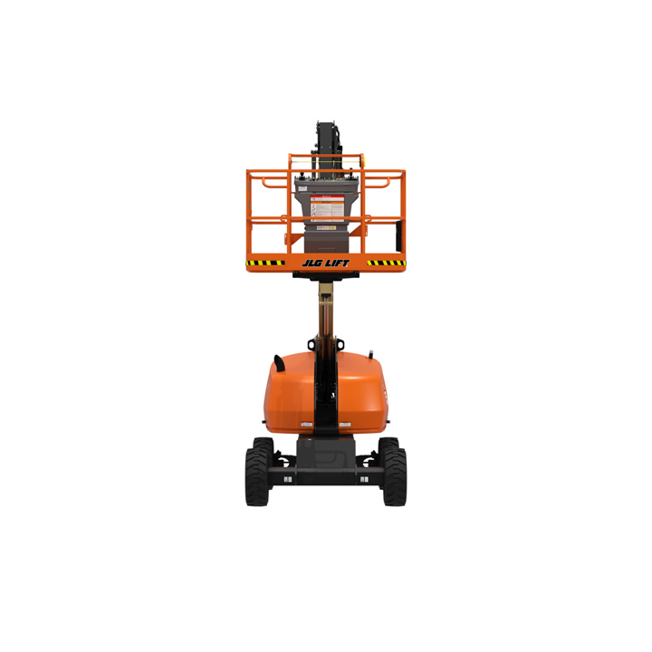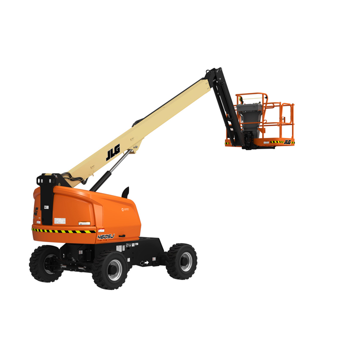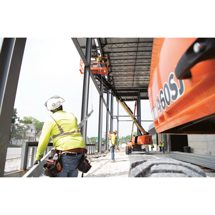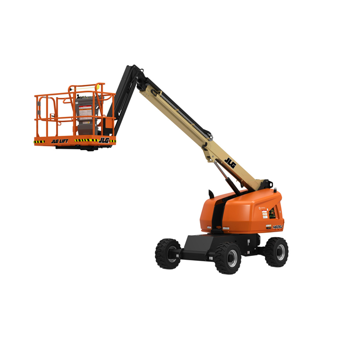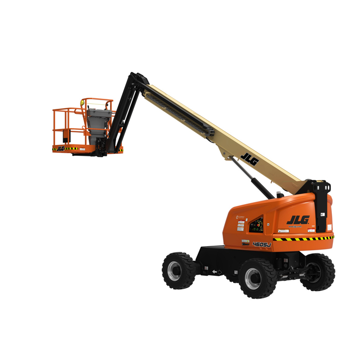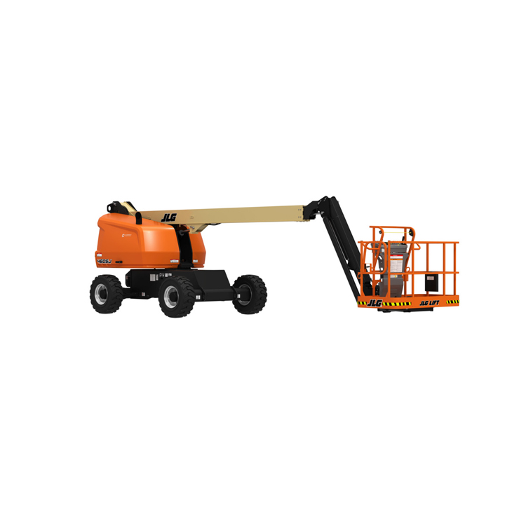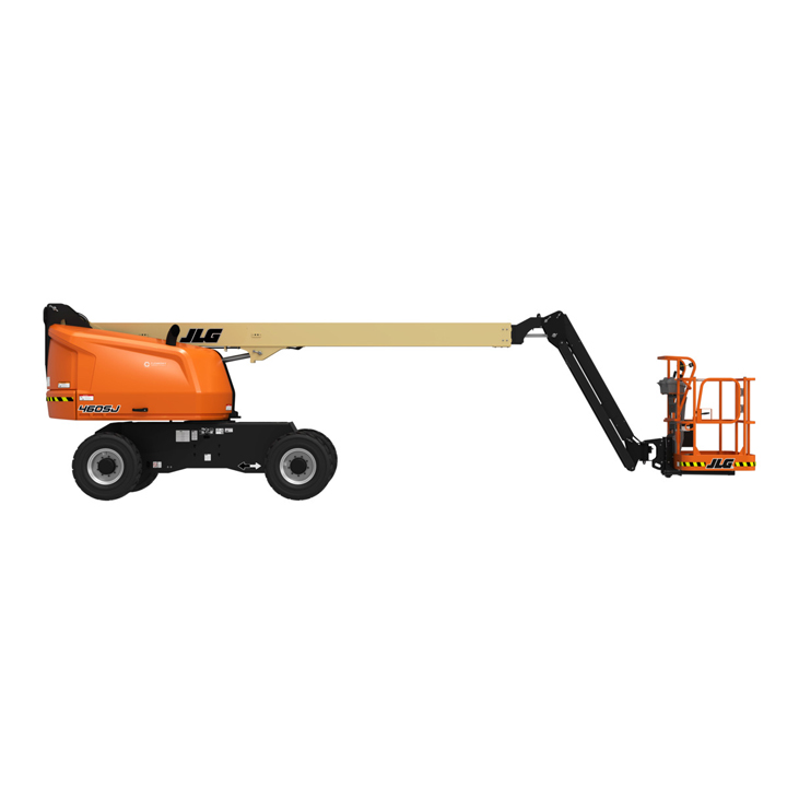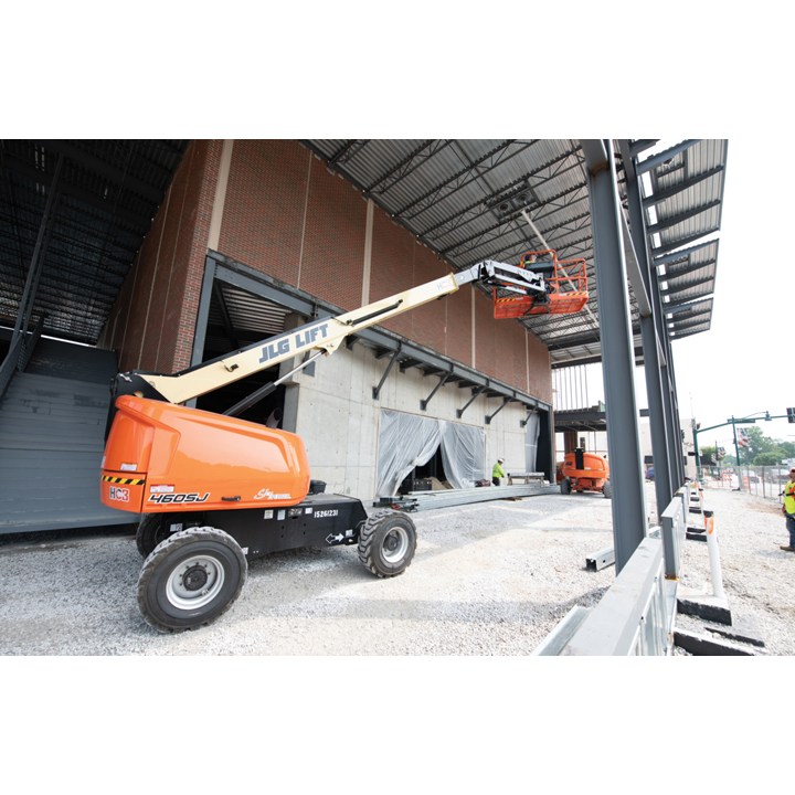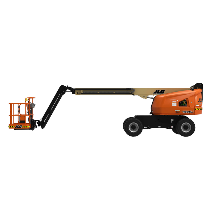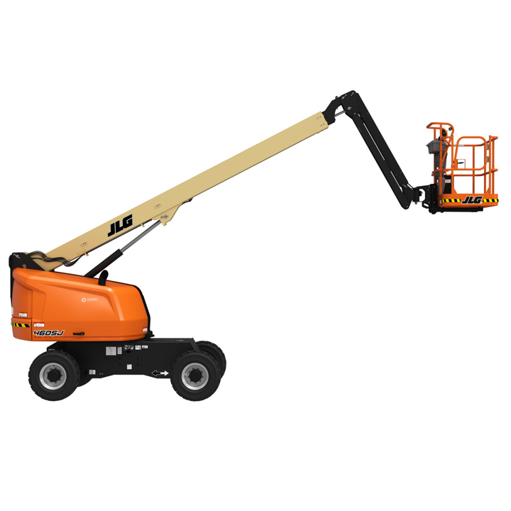 JLG 460SJ Platform height: 46 ft. Horizontal outreach: 41 ft. Platform capacity: 600 lbs. Operating weight: 16,600 lbs. DSL engine