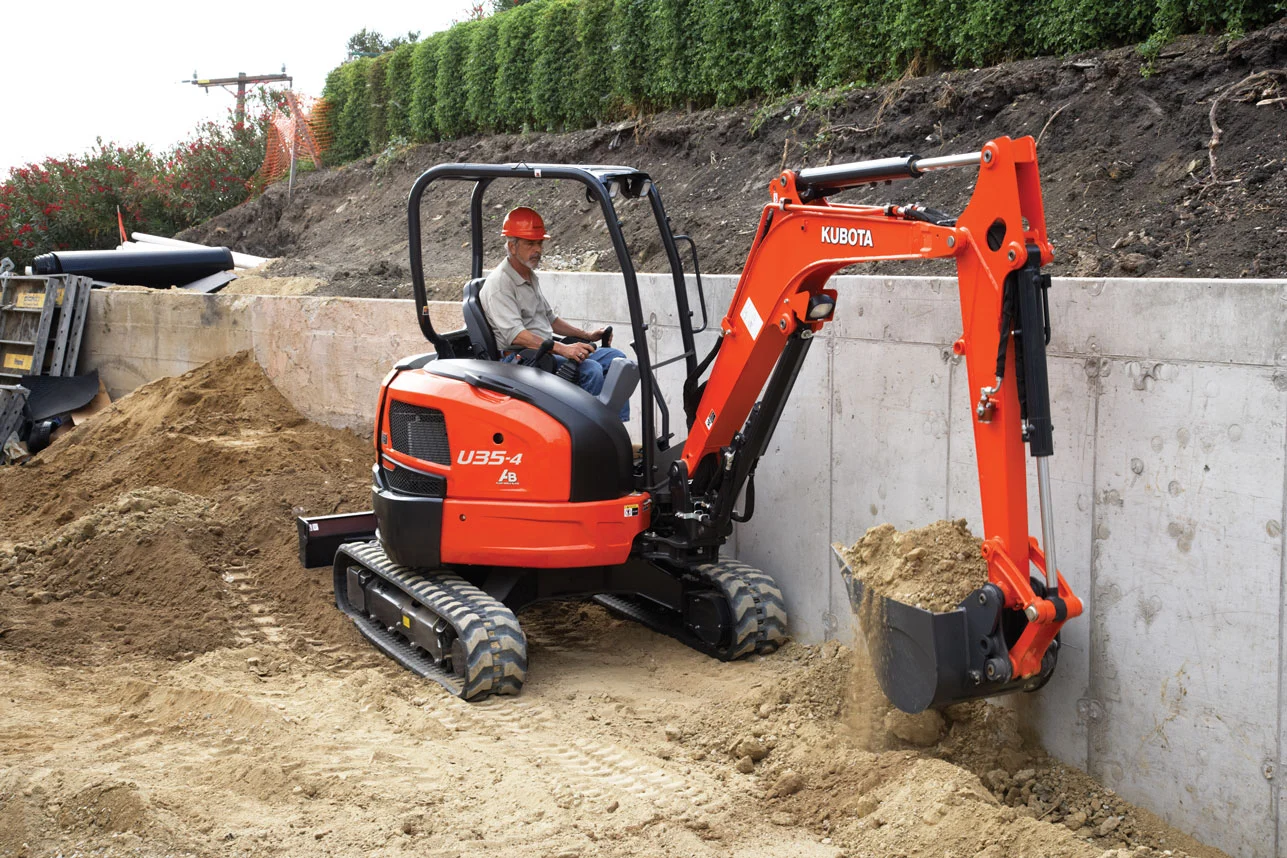 Mini Excavator – 7,000 lbs. Kubota U35 Overall length: 15 ft. – 7 in. Overall Width: 5 ft. – 7 in. Overall height: 8 ft. – 1 in. Dig depth: 14 ft. – 5 in. Operating weight: 8,129 lbs.